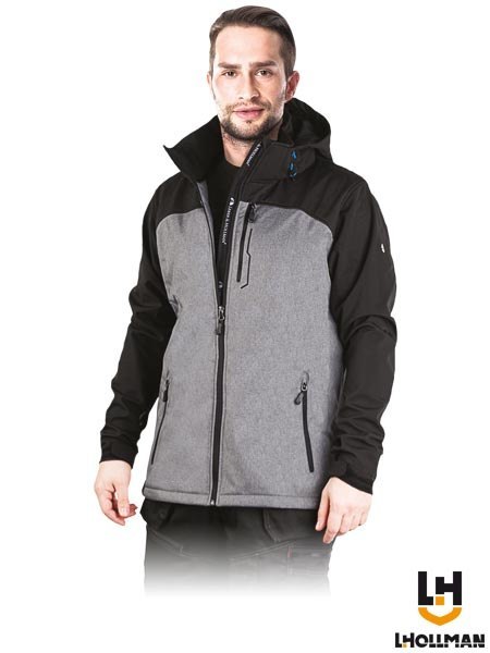 - materiał główny: trójwarstwowa szara tkanina softshell 100% poliester twill, membrana TPU, polar 100% poliester o gramaturze 280 g/m2
